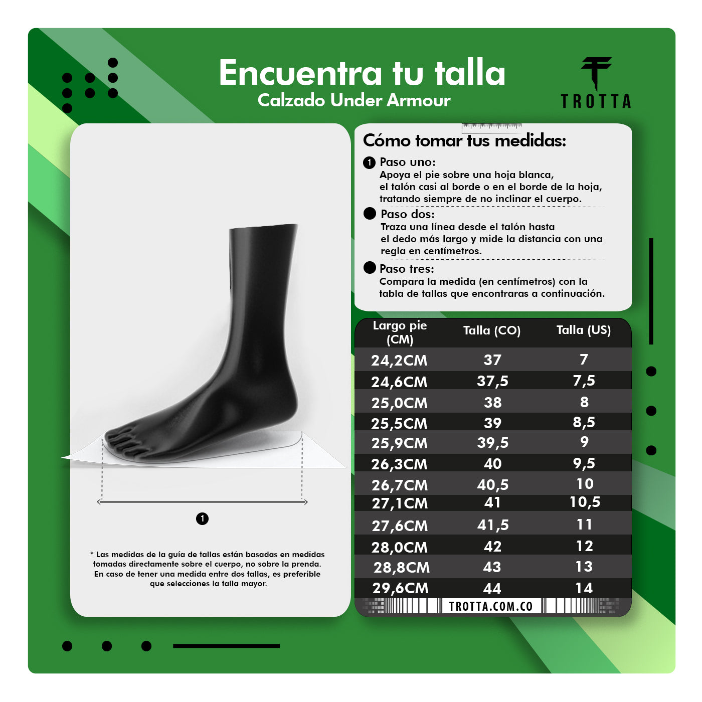 Sigue estos sencillos pasos para obtener el tamaño correcto. Para un mejor ajuste, mide tus pies al final del día.